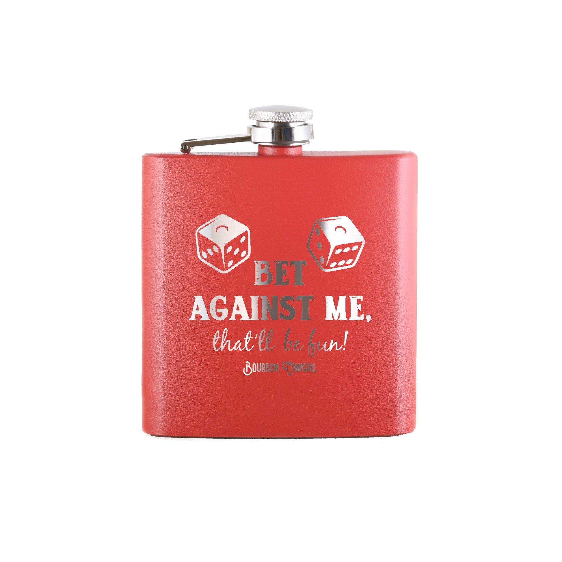 Bet Against Me That'll Be Fun flask is for the self-confident, tough as nails, modern woman who doesn’t take any crap. She’s not about drama and will stand up for herself if and when appropriate. This pocket flask is the best gift for your hardcore girl who considers Beth Dutton or Ruth Langmore her spirit animal. Featuring a set of dice appropriately set showing snake eyes. A funny gift for your best friends and all the girls as you head to a birthday party, girl’s night out or a weekend getaway with your tribe. Get a different design or color for each friend and give her a gift she can use daily and cherish always.