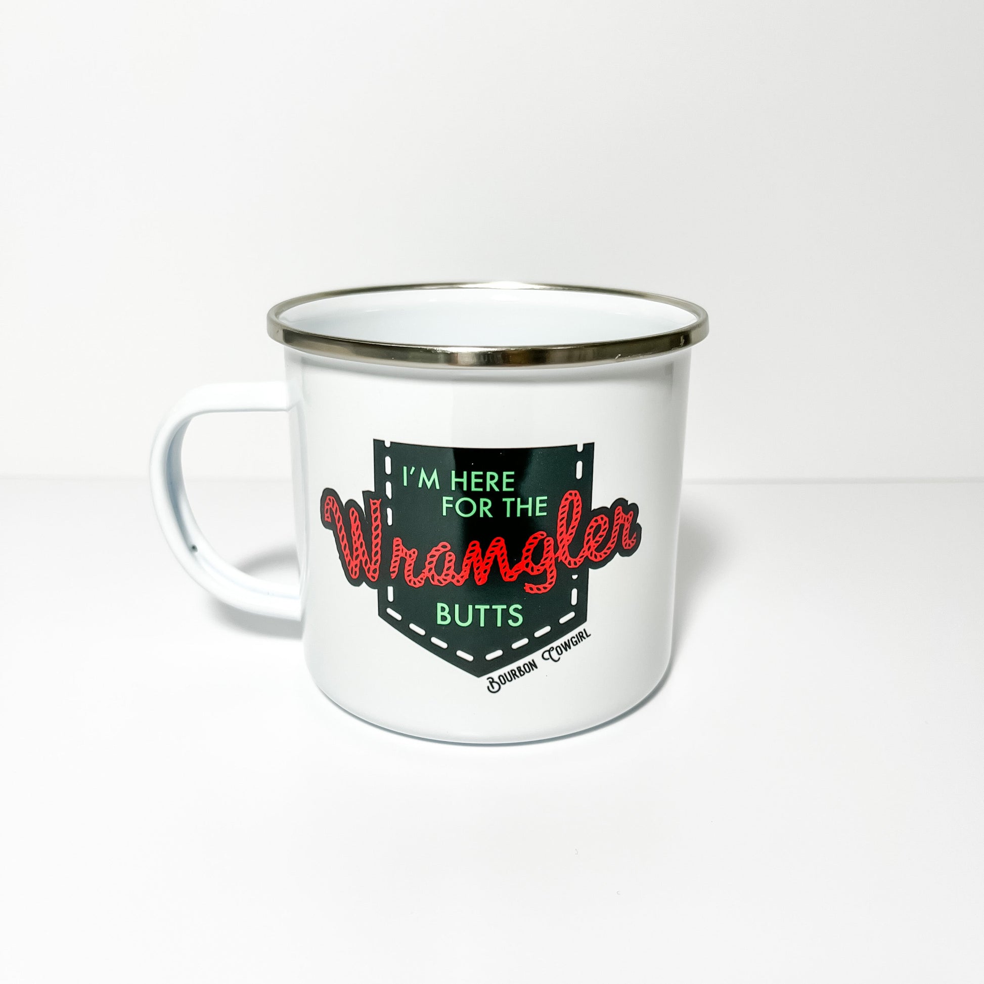 I'm Here for the Wrangler Butts metal campfire mug. If you know a cowgirl who appreciates a good lookin' cowboy or two, this coffee mug is for her. I mean, who doesn't enjoy a good rodeo now and again? The roping and horseback riding is a sight to see and those bucking bronco riding cowboys are often a sight to behold as well. So why not advertise your obsession on this fun and unbreakable metal camping mug? Our sublimated camp mug with 3 color printed design will not rub off or scratch off. Won't break like other coffee mugs making it great for camping and traveling.