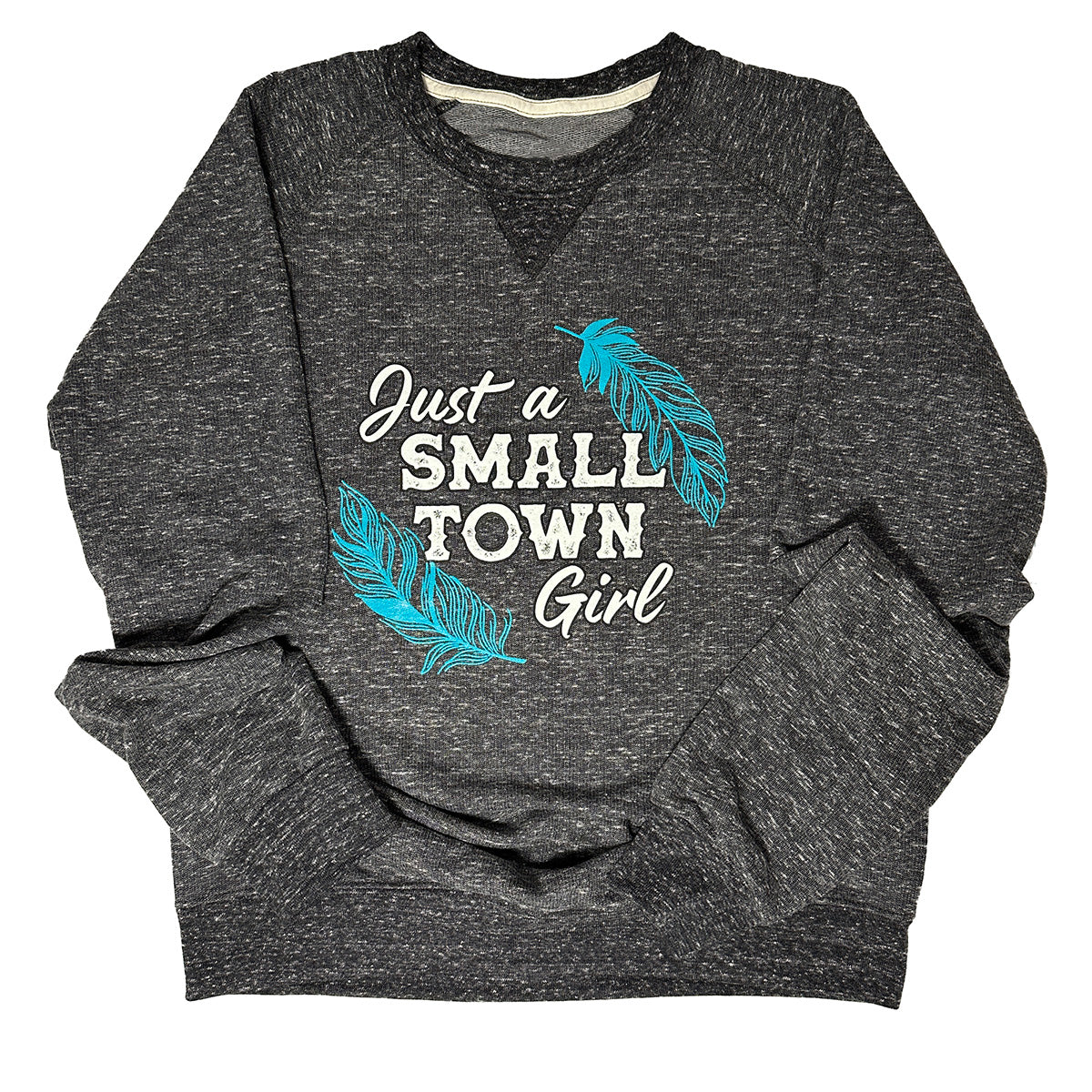 Just a Small Town Girl graphic crew neck sweatshirt is perfect for women of any age or era. Whether you remember the popular Journey song from the 80's or you are proud to hail from a small town, are a farm girl or just enjoy the country life, our soft, lightweight sweatshirt will be super cool. This popular Small Town Girl shirt features gorgeous feathers around the cool font. Perfect for the woman who loves her hippie chick, gypsy soul style.