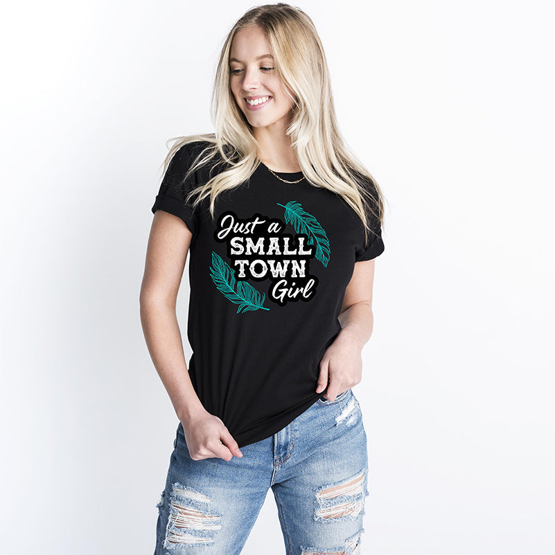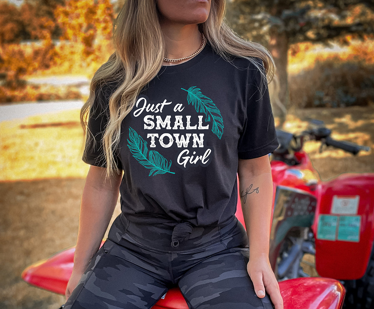 Just a Small Town Girl graphic tee Tshirt is perfect for women of any age or era. Whether you remember the popular Journey song from the 80's or you are proud to hail from a small town, are a farm girl or just enjoy the country life, our soft, relaxed tee will be super cool. This popular Small Town Girl tee features gorgeous feathers around the cool font. Perfect for the woman who loves her hippie chick, gypsy soul style.